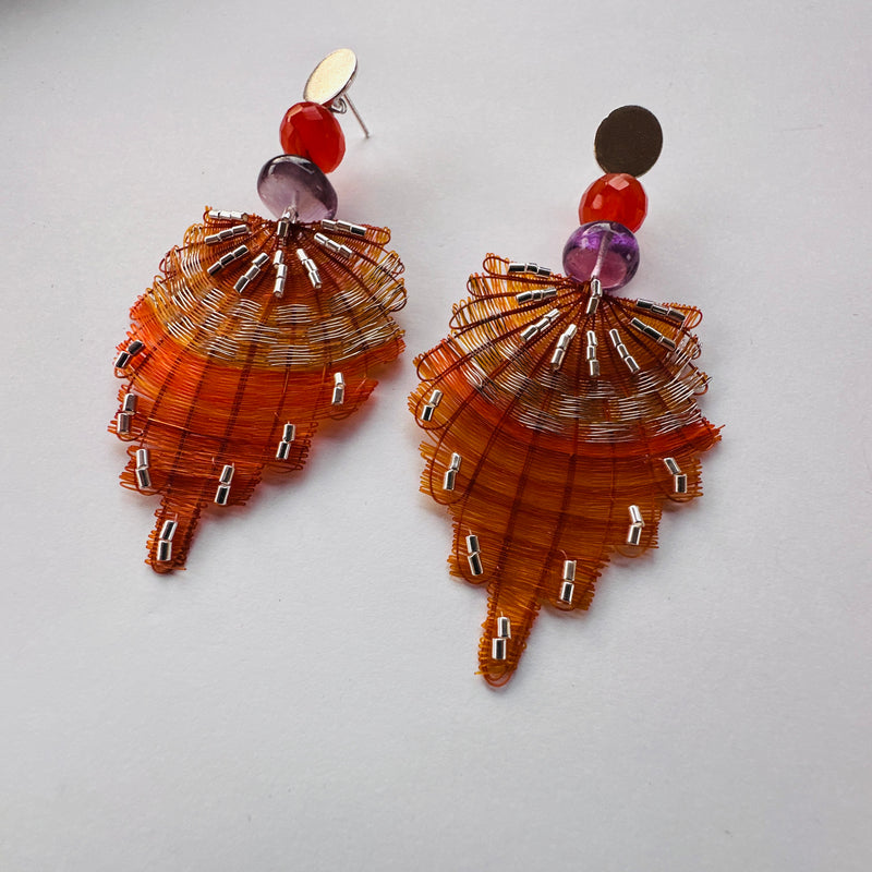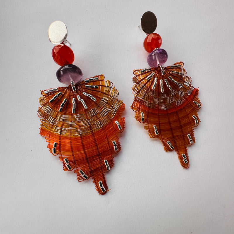 Hoops woven with horsehair, in red and fuccia colors, embroidered with bronze balls.