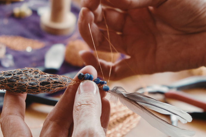 Aros tejidos a telar con hilos de cobre, con un octaedro de fluorita en su interior.